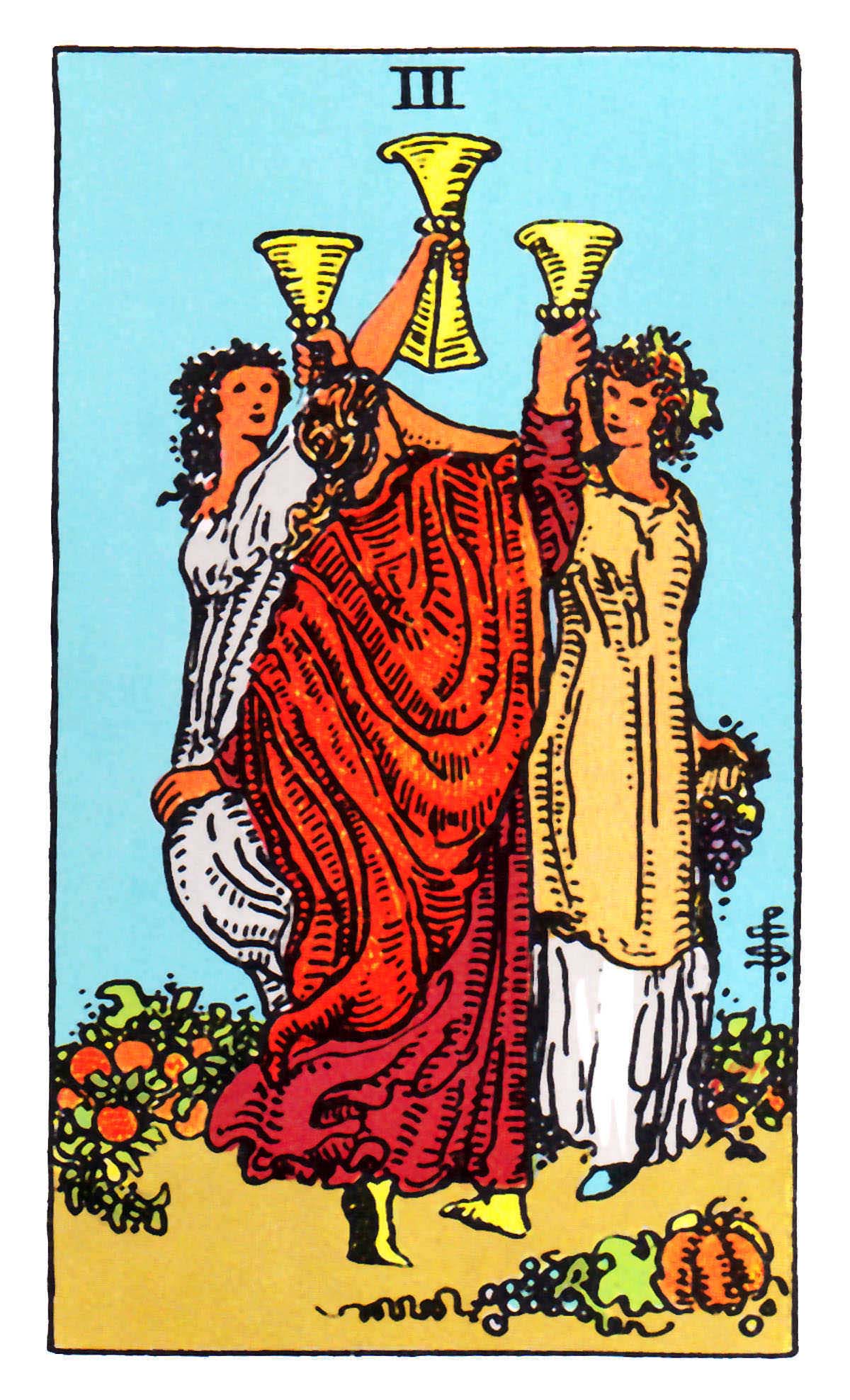 A. E. Waite's description of the cardThree of CupsCelebration in the merry company of dear friends. A time to remember.