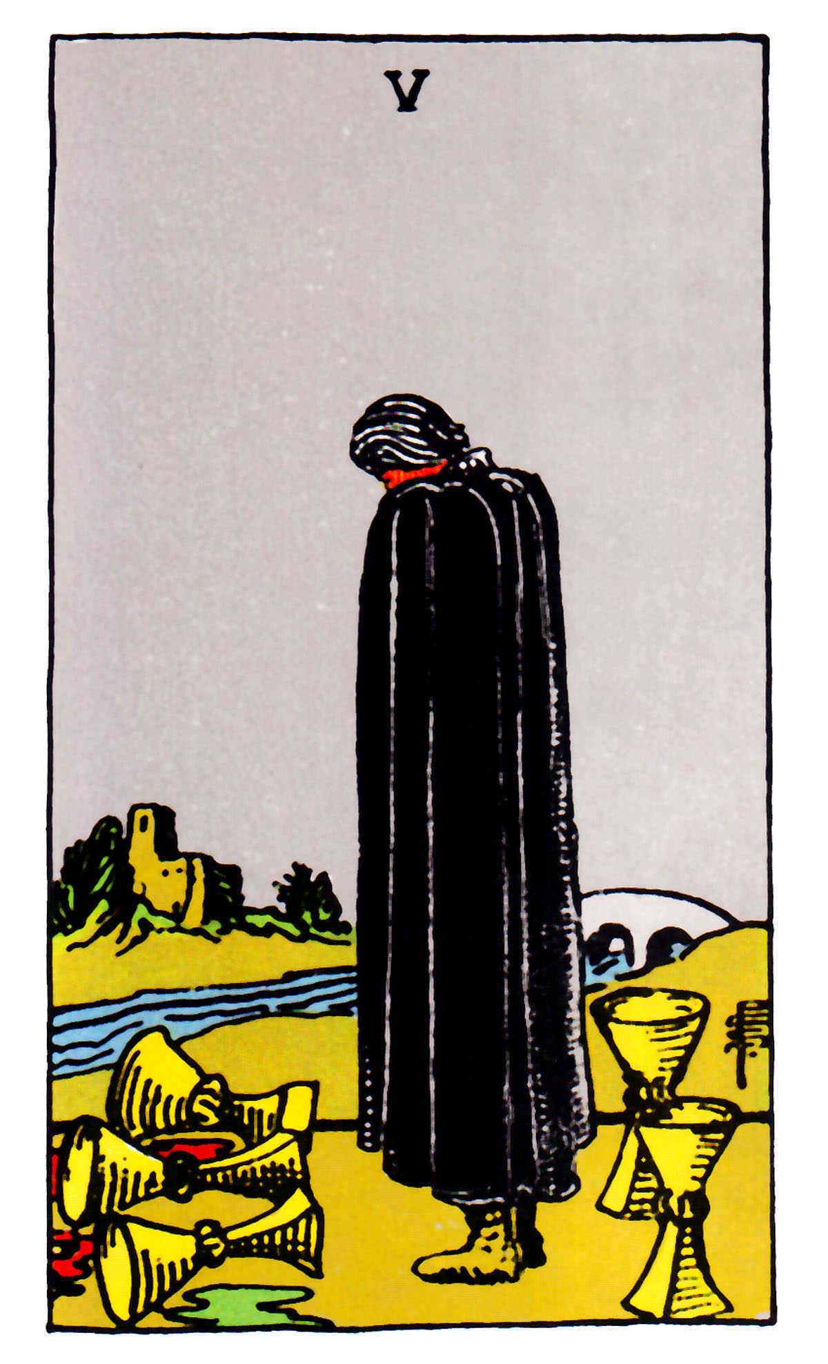 A. E. Waite's description of the cardFive of CupsDespair. Life lost its taste, there's no remedy against gloom — but accepting it. It will dissolve, eventually.